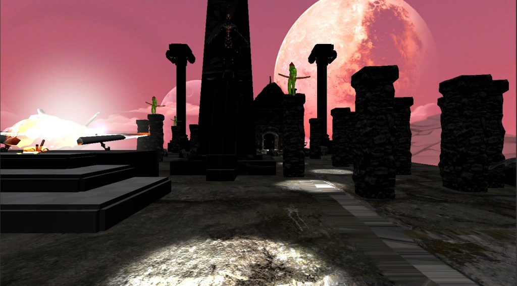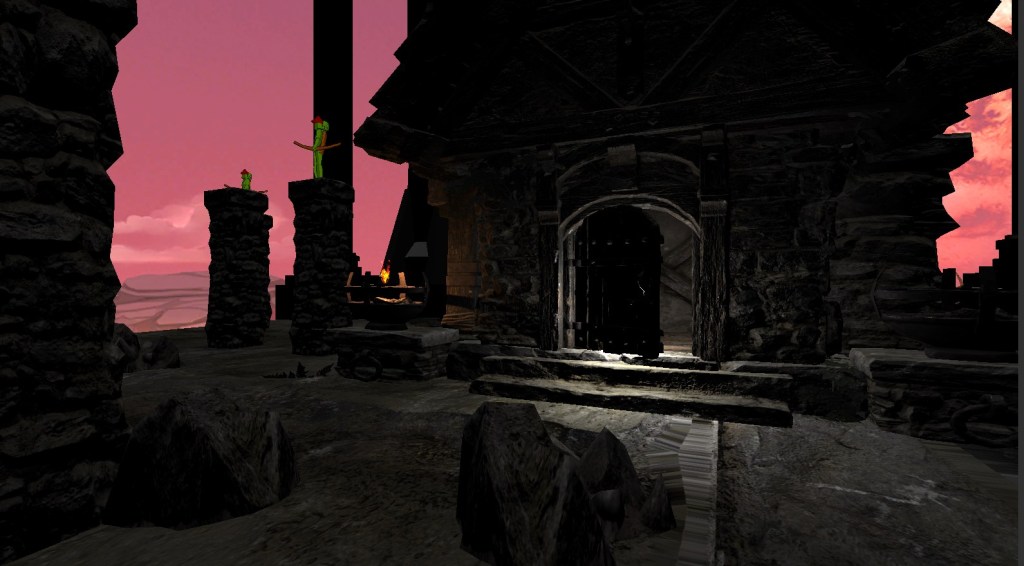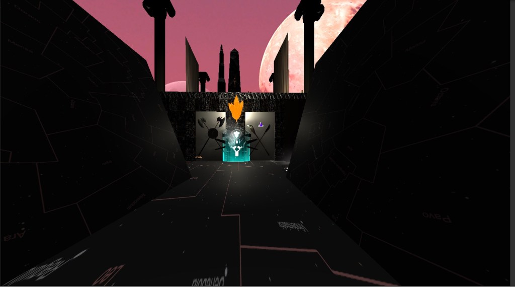 Some of the difficulties I came across included sizing everything and making sure there wasn’t methods for the player to accidentally fall off. Also the lighting was a big issue. I did a sort of dungeon/ medieval theme which required a dark tone to the world, yet this also meant that it was very hard to see around the actual world. Adding lights would then cast very dark shadows which made it almost impossible to see. I fixed this by adding point lights and spotlights which allowed me illuminate certain areas preventing pitch black corners. I also left the ceiling open and made the world a volcanic themed wallpaper to add some aesthetic visuals. I then added some battle music to add to the theme that the virtual world had.
